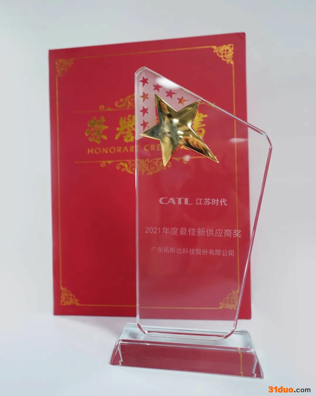 近日,拓斯达凭借专业的技术实力、优秀的产品服务和诚信的合作态度,荣获CATL江苏时代2021年度“最佳新供应商奖”称号。