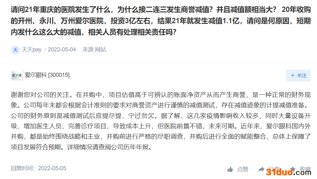 5月9日午后,爱尔眼科股价跳水,大跌10%。有市场传闻称公司二季度业绩不及预期。对此,公司回应中国证券报·中证金牛座记者称:“这才进入5月,二季度还有一大半时间,这个说法莫名其妙。”