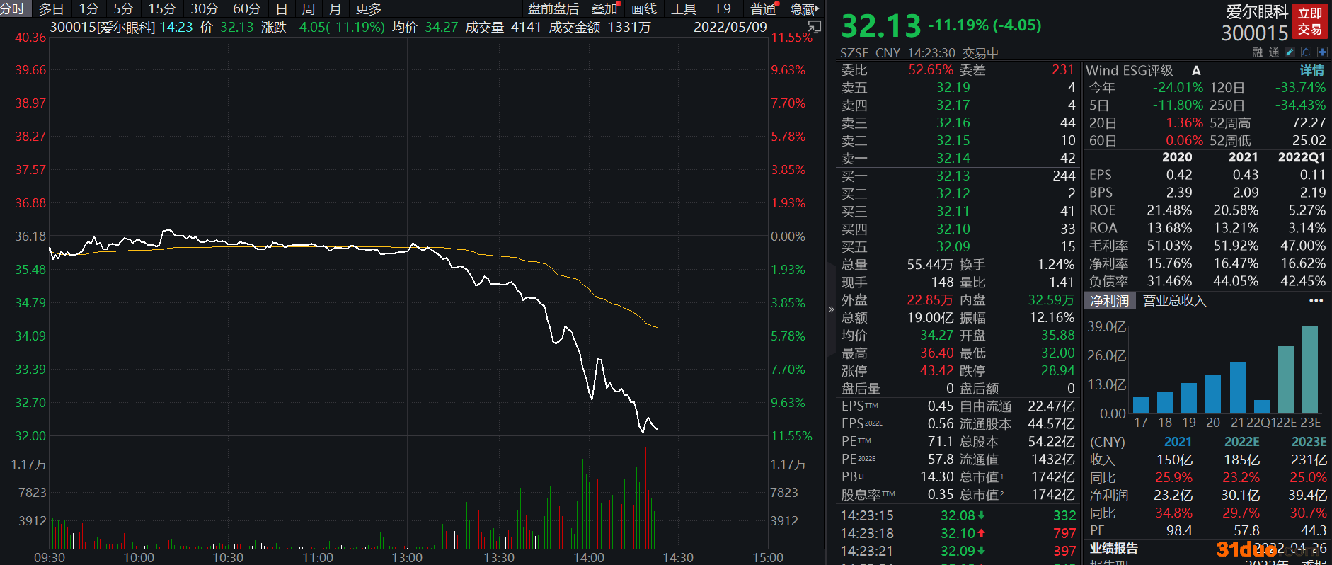 5月9日,爱尔眼科股价午后跳水,总市值回到1800亿元下方。