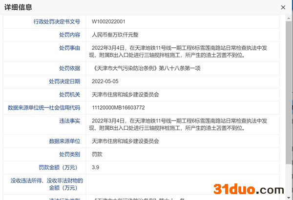 行政处罚决定书显示,2022年3月4日,在天津地铁11号线一期工程6标雪莲南路站日常检查执法中发现,附属B出入口处进行三轴搅拌桩施工,所产生的渣土苫盖不到位。违反了《天津市大气污染防治条例》第六十一条,根据《天津市大气污染防治条例》第八十八条第一项,天津市住房和城乡建设委员会决定对其处以罚款3.9万元。