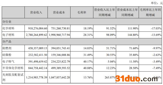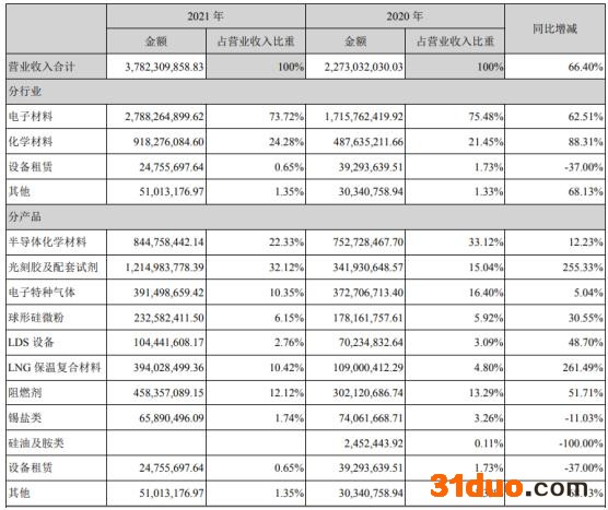 2021年化学材料和电子材料的营业成本同比增长较大,尤其是电子材料同比增长144.8%。营业成本的高企极大程度压缩产品毛利率。