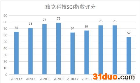 从雅克科技和讯SGI指数评分分析,公司获得57分,从图中显示的近九个季度来看,整体得分不理想,也从侧面反映公司近九个季度业绩平平。