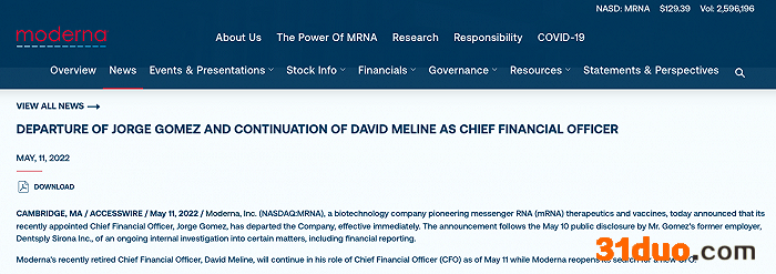 5月11日晚间,美国生物科技公司莫得纳(Moderna)官网宣布,其最近任命的首席财务官Jorge Gomez已经离开公司。