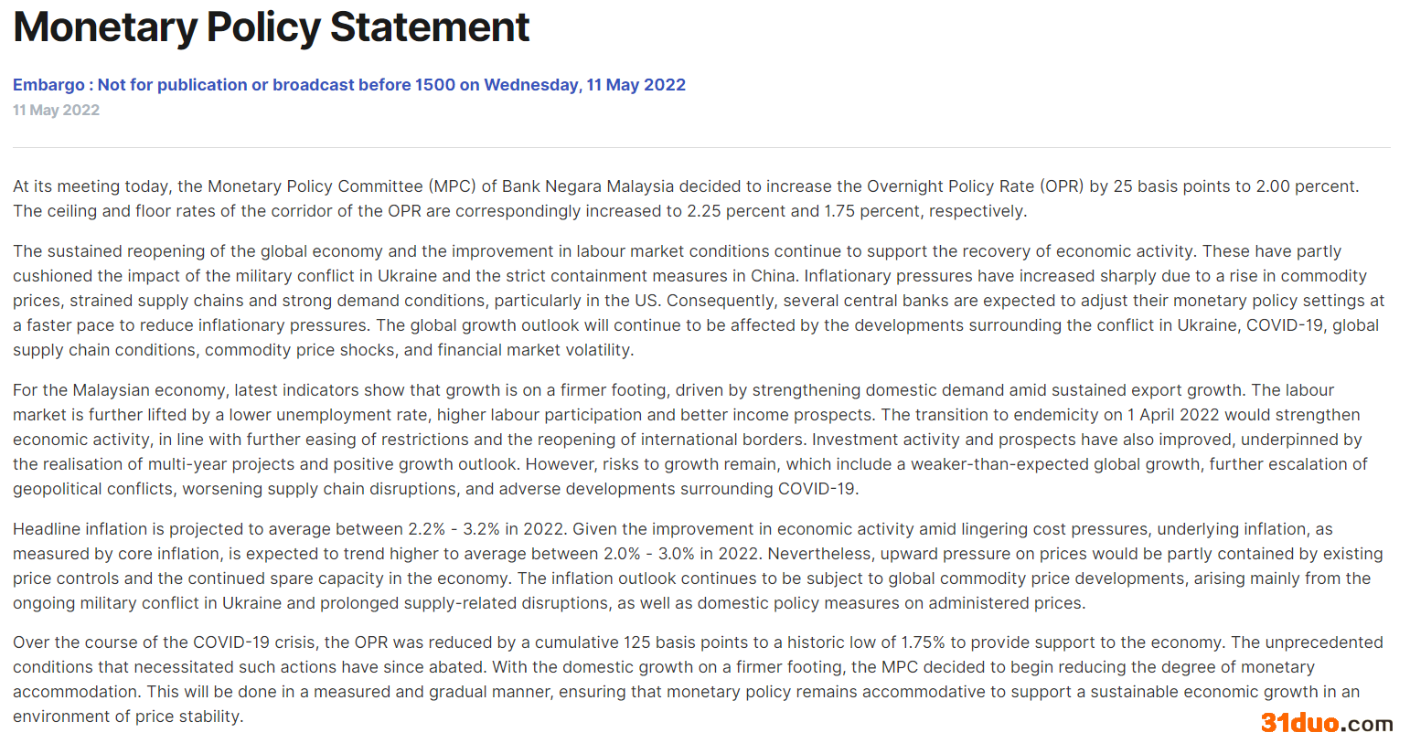 亚洲交易时段,马来西亚央行上调基准利率,采取行动来抵御通胀压力。马来西亚央行把隔夜政策利率提高25个基点至2%。 来源:马来