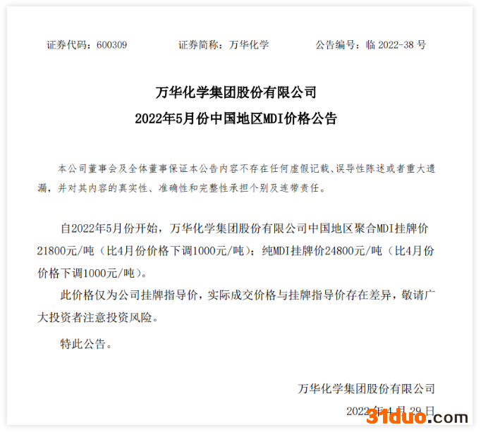 万华化学公告称,5月开始,中国地区聚合MDI挂牌价21800元/吨(比4月份价格下调1000元/吨),纯MDI挂牌价24800元/吨(比4月份价格下调1000元/吨),这已经是万华化学连续两个月下调MDI挂牌价。