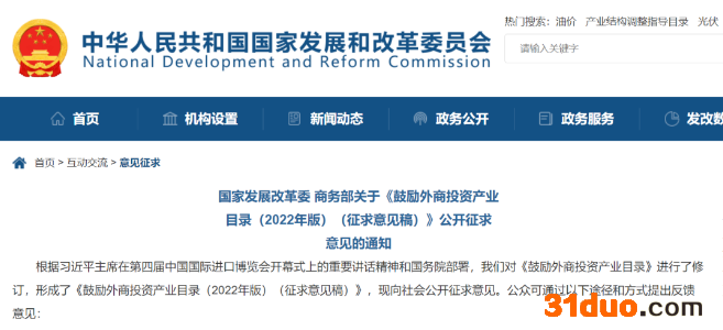 5月10日,国家发展改革委、商务部就《鼓励外商投资产业目录(2022年版)(征求意见稿)》公开征求意见,截止日期为2022年6月10日。