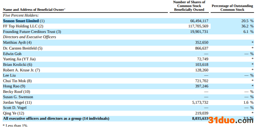 报告显示,在董事和高管持股信息中,创始人、前CEO贾跃亭个人持有72749股,占比不到1%。CEO毕福康持有866637股,占比不到1%。