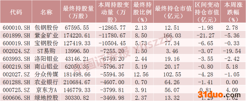 本周北向资金减仓股数前十个股