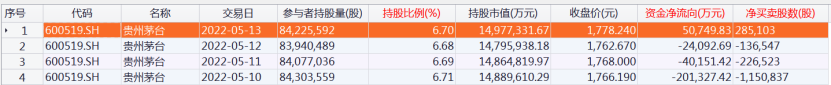 北向资金持股贵州茅台明细数据