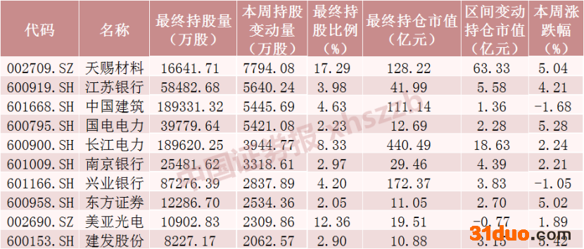 本周北向资金持股增加数前十个股