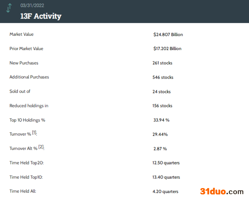 该基金在第一季度的持仓组合中新增了53只个股,增持了31只个股。同时,该基金还减持24只个股并清仓了动视暴雪、通用汽车和优步等59只个股。其中,前十大持仓标的占总市值的48.93%。