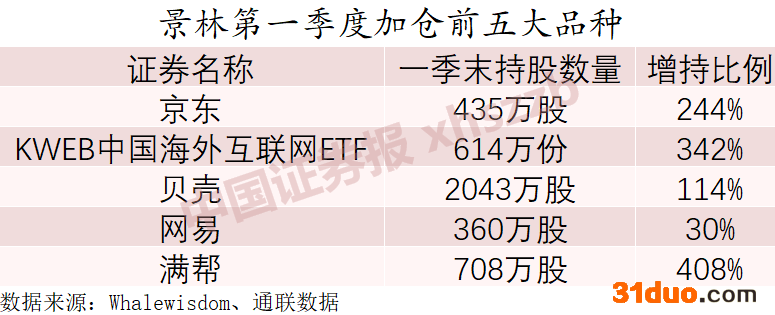 在国内头部投资机构方面,千亿私募景林资产披露的截至3月31日的持仓报告(13F表)显示,网易、贝壳、京东晋升景林最新的美股持仓前三名,东南亚电商巨头SEA的持股市值跌至第四位,涵盖一系列港股的KraneShares中国海外互联网ETF挤进前十并位列第五,遭到减持的拼多多则跌出了持仓前十的位置。