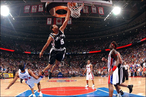 2004年活塞在总决赛以4-1掀翻F4湖人。2005年活塞在东决遇到奥尼尔和韦德领军的热火。热火一度以2-1和3-2领先,但活塞连胜2场,抢七战比卢普斯和普林斯罚球制胜;2005年总决赛前4场,马刺和活塞都大胜对手。天王山之战,霍里在加时赛发威,包括一记力劈华山的扣篮,马刺获胜。活塞拖入抢七后,马刺终以81-74获胜。