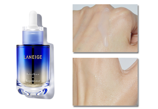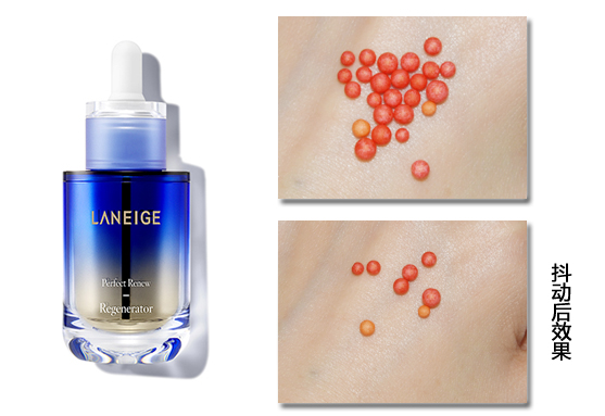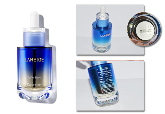 包装非常精致,明亮的蓝色外壳在光下有渐变的颜色,瓶身有兰芝的品牌logo,搭配白色滴管,正面看起来简约时尚。瓶身背面印有产品信息,底部印有使用期限,方便查看。握在手中很有质感。