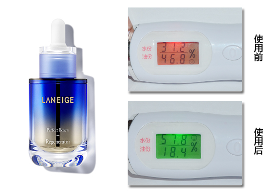 如图可见,使用精华液后皮肤表面水分值提升了26.6%,油分值降低了28.4%,肌肤表面水分含量大幅度提升,含油量大幅度降低,皮肤表面呈现健康水润的状态。证明兰芝致美紧颜修护精华液能快速补水润肤,具有很强的补水效果。