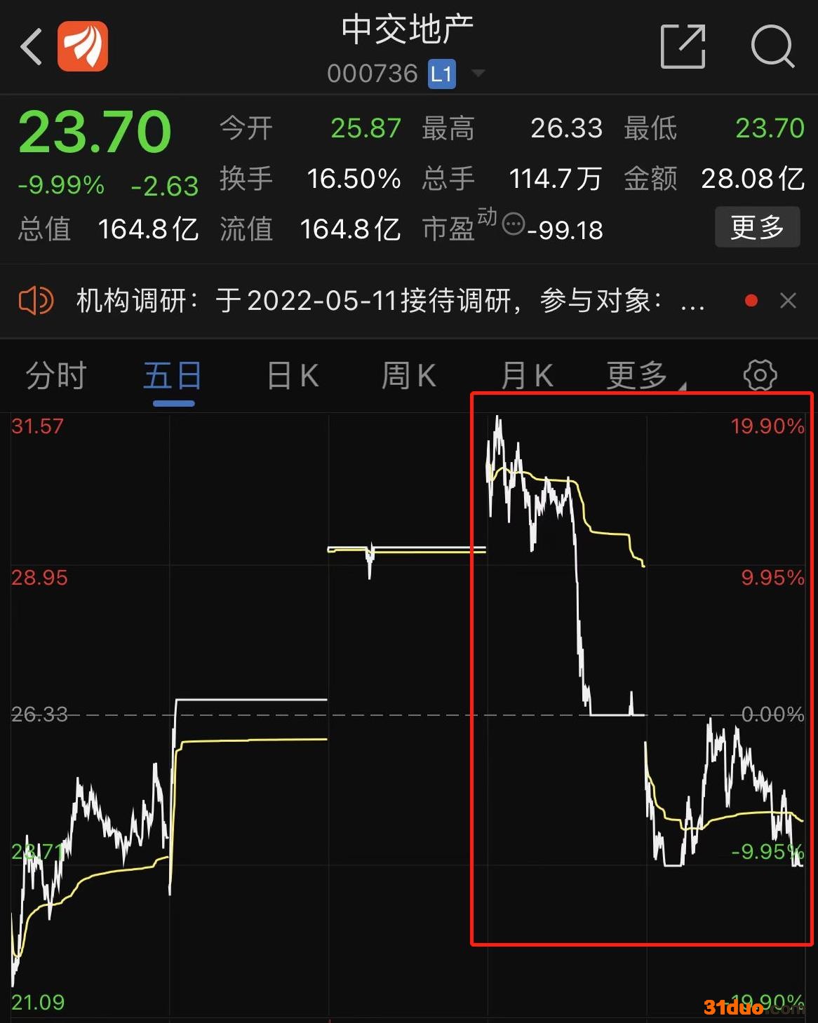 这是继5月12日后的又一次跌停。在此之前,中交地产还是炙手可热的网红大妖股,其在不到两个月的时间里收获了十余个涨停板,区间涨幅超300%。