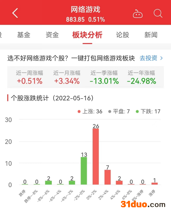 中国经济网北京5月16日讯 今日,网络游戏板块整体涨幅0.51%,其中36只股票上涨,7只股票平盘,17只股票下跌。