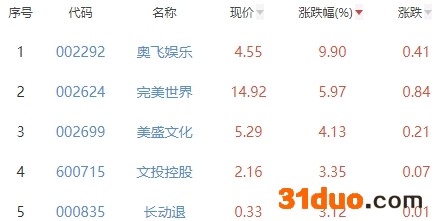 其中,奥飞娱乐、完美世界、美盛文化、文投控股、长动退位列板块涨幅前五位,涨幅分别为9.90%、5.97%、4.13%、3.35%、3.12%。