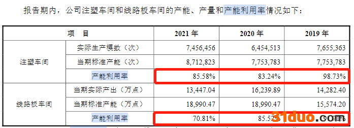 报告期内,注塑车间的产能利用率由98.73%下降至85.58%,线路板车间的产能利用率由91.71%下降至70.81%。