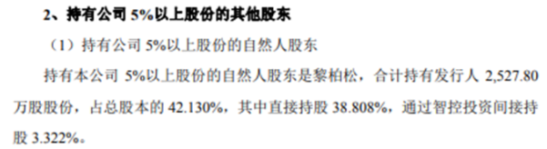 彼时黎柏松直接持有智迪科技38.808%的股权,间接持有3.322%的股权,合计持有智迪科技42.13%的股权。