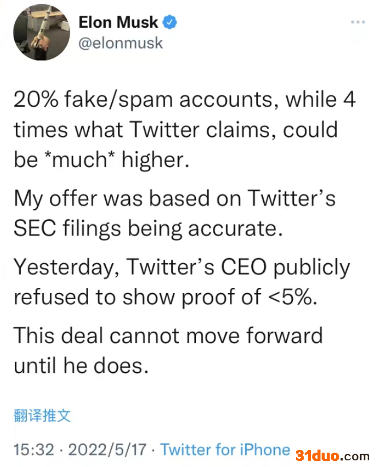 马斯克称,“昨日推特CEO公开拒绝提供虚假账户占比低于5%的证据。除非推特证明虚假账户少于5%,否则交易无法推进。”