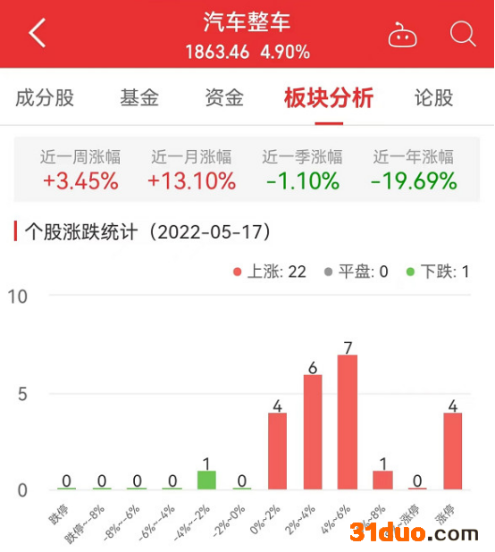 中国经济网北京5月17日讯 今日,汽车整车板块整体涨幅4.90%,其中,22只股票上涨,1只股票下跌。
