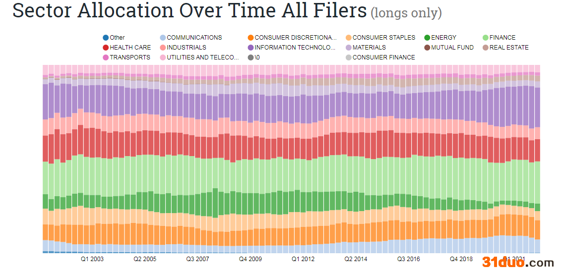 在美国投资机构投资的行业分布图中可以看出,金融和IT行业仍然是美国投资机构配置最多的行业。不过,今年第一季度,随着油价飙升,美国投资机构大幅增加了对能源领域的投资,其行业配置占比从前一季度的2.78%提升到了4.03%。同时,伴随着美股科技股在今年初以来的遇冷,美国投资机构对IT行业的配置比例也从前一季度的22.46%减少到21.13%。