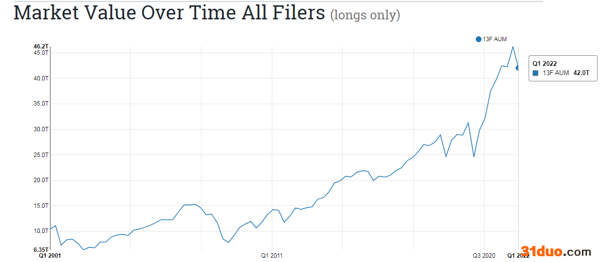 根据美国投资机构13F报告统计数据显示,美国投资机构的资产管理规模在此前经历了数个季度的增长后,在今年第一季度从前一季度的46.2万亿美元下滑至42万亿美元,下滑幅度为约9%。