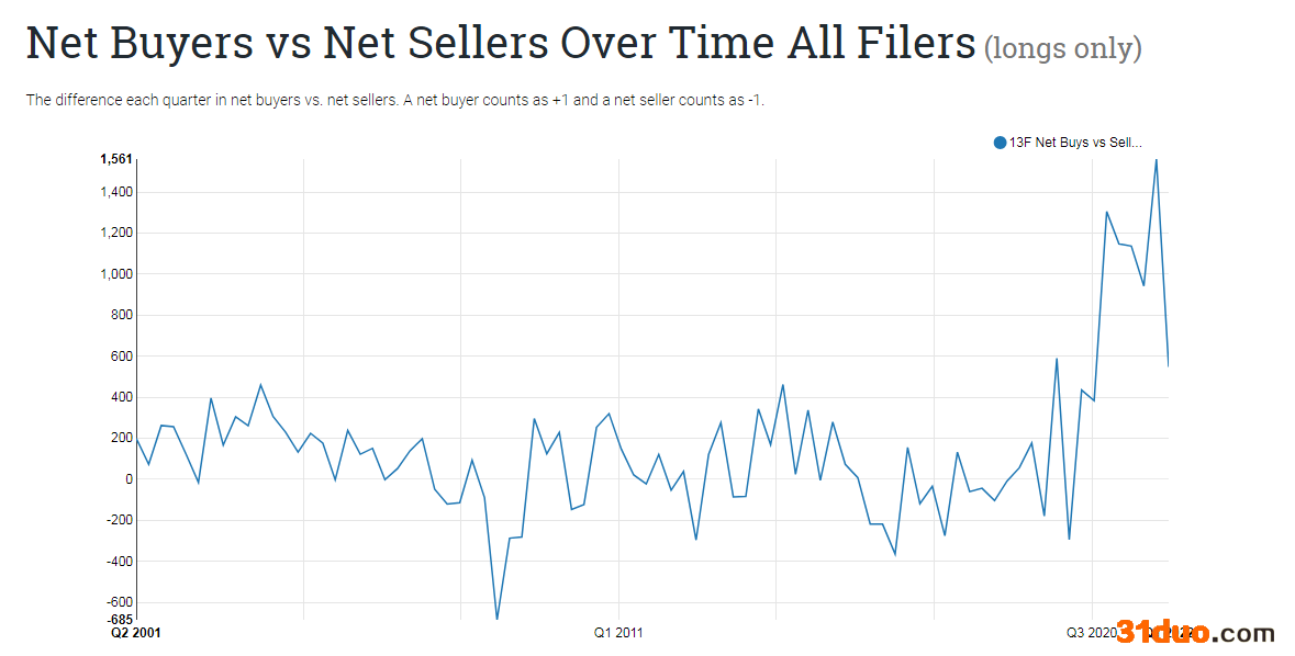 今年第一季度,美国投资机构中净买入者和净卖出者的差值下滑到了548家,而前一季度的这一数值达到了过去多年来的高位1561家,这意味着今年第一季度净买入机构的数量大幅下滑,而净卖出机构的数量大量增加。