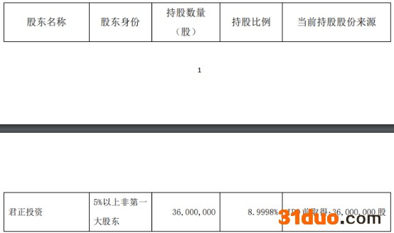 截止减持计划公告之日,君正投资持有东鹏饮料首次公开发行前发行的股份3600万股,占公司总股本的8.9998%,为公司第二大股东,股份来源为公司首次公开发行前取得的股份。