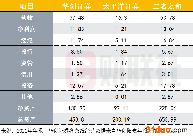 此外,华创证券与太平洋证券两家券商净资产之和为228.06亿元,总资产之和为653.99亿元。