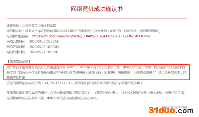 本次拍卖竞价周期1天,从5月26日10点至27日10点,最终仅有一家机构即华创证券报名,该机构在拍卖结束9:42出价,出价为起拍价17.26亿元。