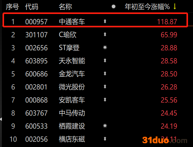 从所属板块来看,中通客车年内涨幅位列新能源车板块首位。