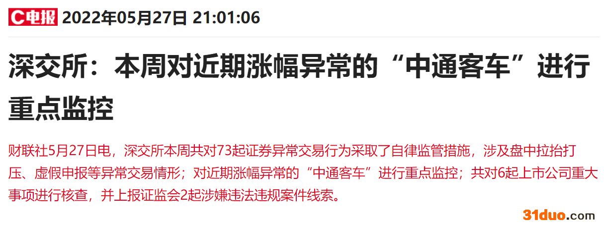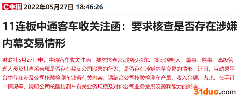 屋漏偏逢连夜雨,晚间深交所表示,本周将对近期涨幅异常的“中通客车”进行重点监控。