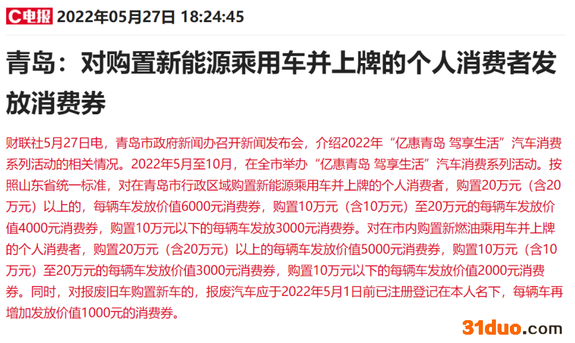 盘后,青岛政府发布“亿惠青岛驾享生活”活动,在青岛市行政区域购置新能源乘用车并上牌的个人消费者,购置20万元以上的,每辆车发放价值6000元消费券。