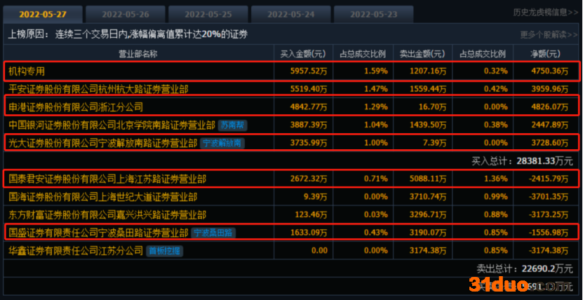背后是哪些资金在疯狂买入?中通客车盘后公布的三日榜数据显示,龙虎榜资金净买入5691.13万元。机构专用位列买一席位,净买入4750.36万元。知名游资申港证券浙江分公司、光大证券宁波解放南路营业部、国泰君安上海江苏路营业部、宁波桑田路位列买三、买五、卖一和卖四席位。