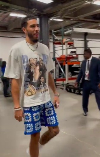 赛前,塔图姆来到球馆时身穿一件印有杜克大学恩师老K教练的T恤。