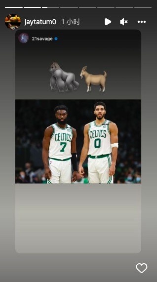 赛后塔图姆更新INS,他转发了说唱歌手21 Savage的一条动态,内容为杰伦-布朗和自己的同框图,配文为“