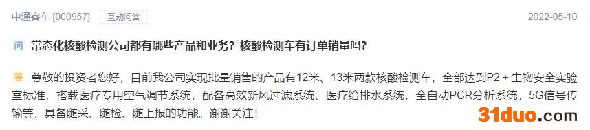 另外,关注函指出,近日。互动易平台中存在涉及公司核酸检测车业务有关内容。