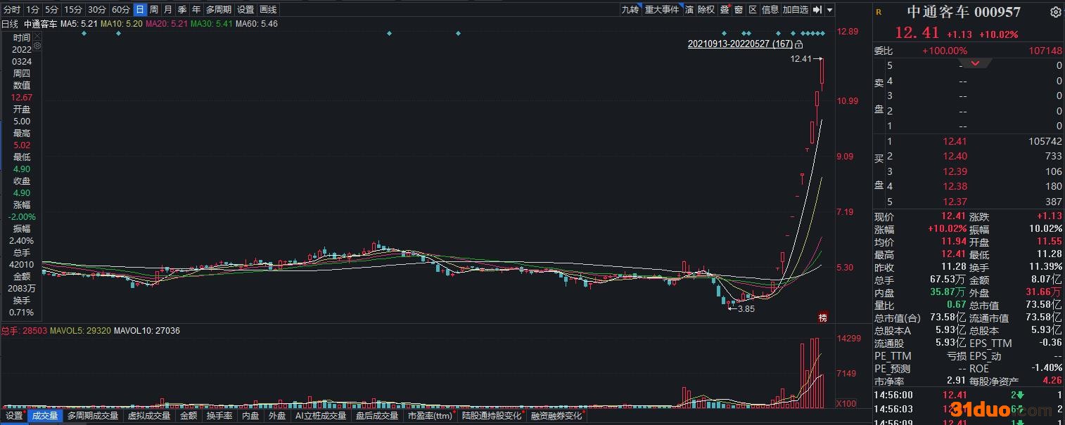 5月27日,中通客车再次触及涨停,走出11连板,报12.41元/股,成交额超7亿元。11个交易日累计上涨185.94%。