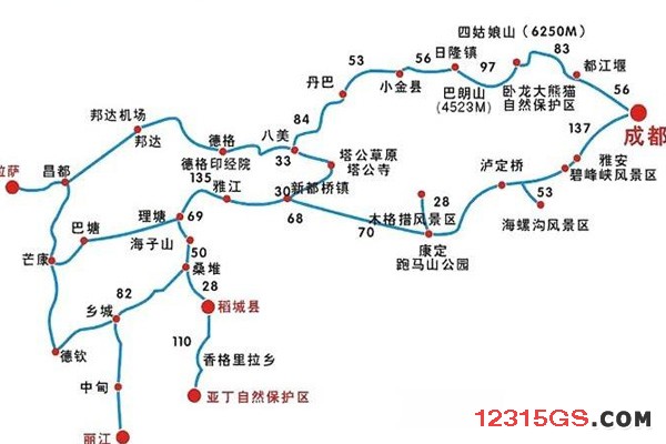线路一:成都——都江堰——映秀——四姑娘山——小金——丹巴——八美——塔公——新都桥——雅江—— 理塘——稻城亚丁;