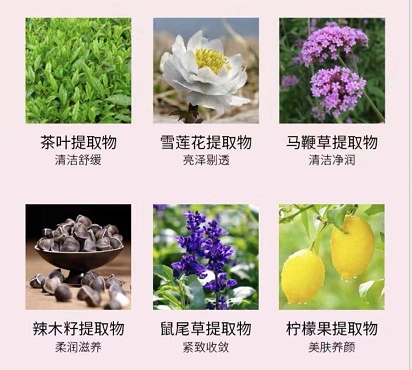 雪莲花提取物:保湿舒缓;可以抑制络氨酸酶活性;有很强的抗氧化性黄酮及芦丁,能够起到清除自由基的作用;可抗过敏,缓解红肿。