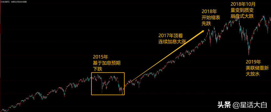 一直到2018年,美联储开始大幅度缩表后,美股才出现式下跌。