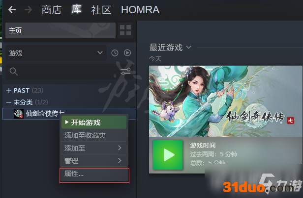 这个方式适合绝大部分Steam游戏。玩家首先在游戏库中右键单击自己想要修改的游戏,接着玩家选择属性。