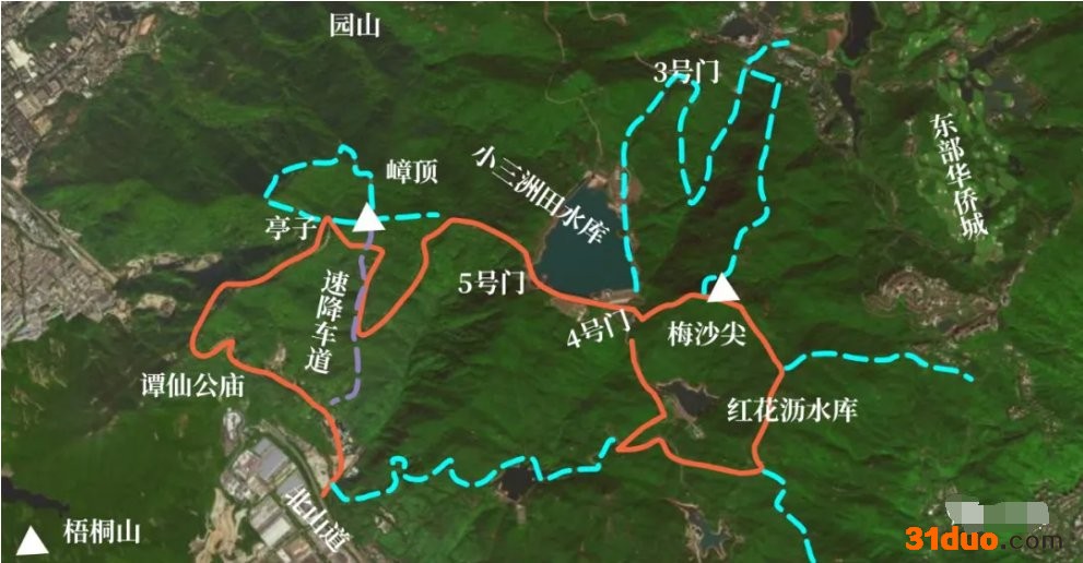 这次下山走的是另一边的台阶路,下去会遇到几个岔路,记住往右走。沿着山下的水库一圈,再回到4号岗亭,从原路返回。