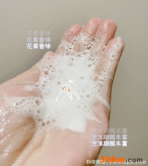 它的的泡沫还行,不算特别多,我一般都是用沐浴球来打泡沫,打出来的泡沫还挺绵密的,也挺好冲洗,一点也不油腻,洗完之后身上摸着挺水润的。