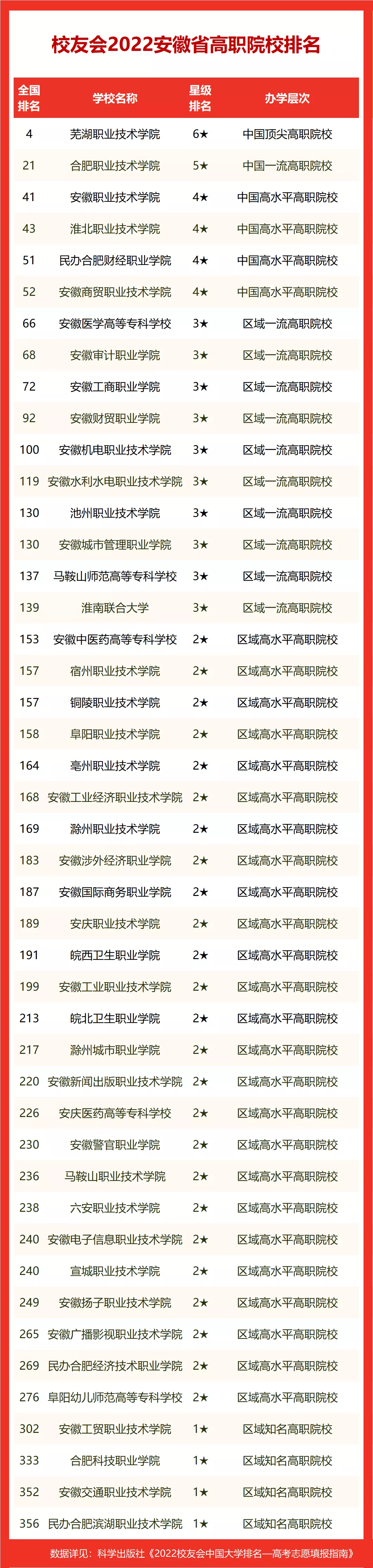 芜湖职业技术学院雄居2022安徽省高职院校排名冠军,安徽审计职业学院跻身前3强