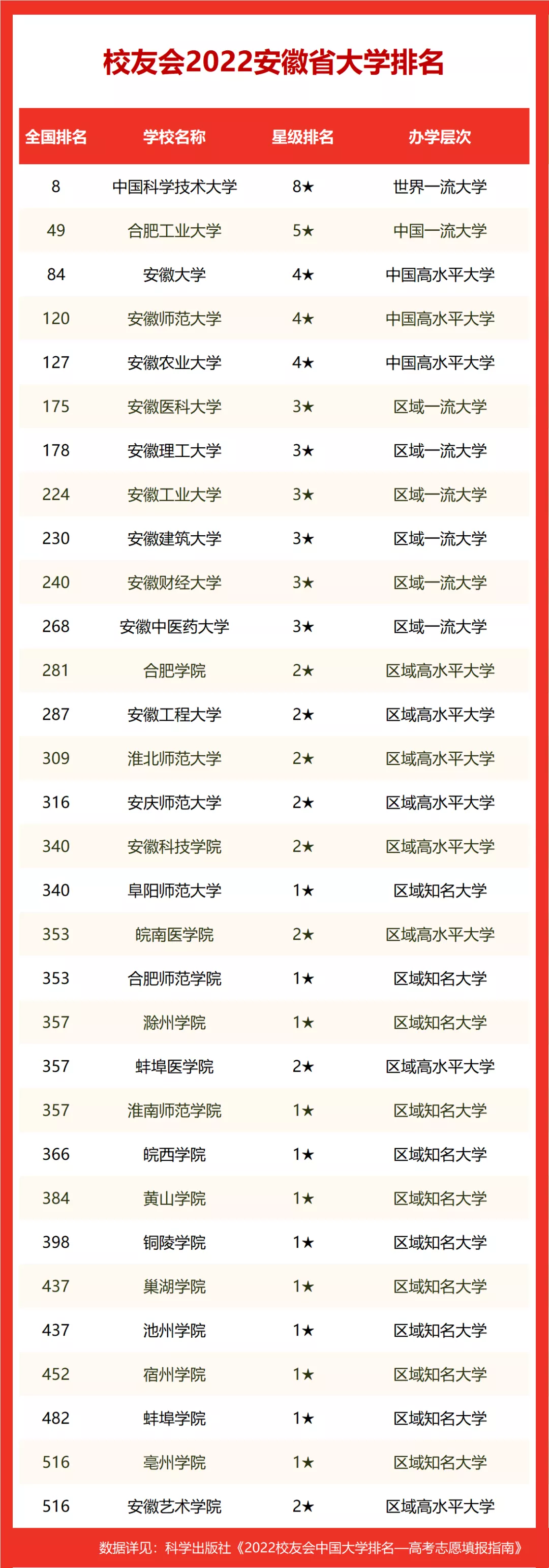 为了给2022年全国高考考生选择报考安徽省高校提供参考指南,2022年1月25日,全国第三方大学评价机构艾瑞深校友会网正式发布《2022校友会中国大学排名—高考志愿填报指南》,最新公布校友会2022安徽省大学排名,中国科学技术大学等1所高校跻身全国10强,安徽大学等3所跻身全国百强。