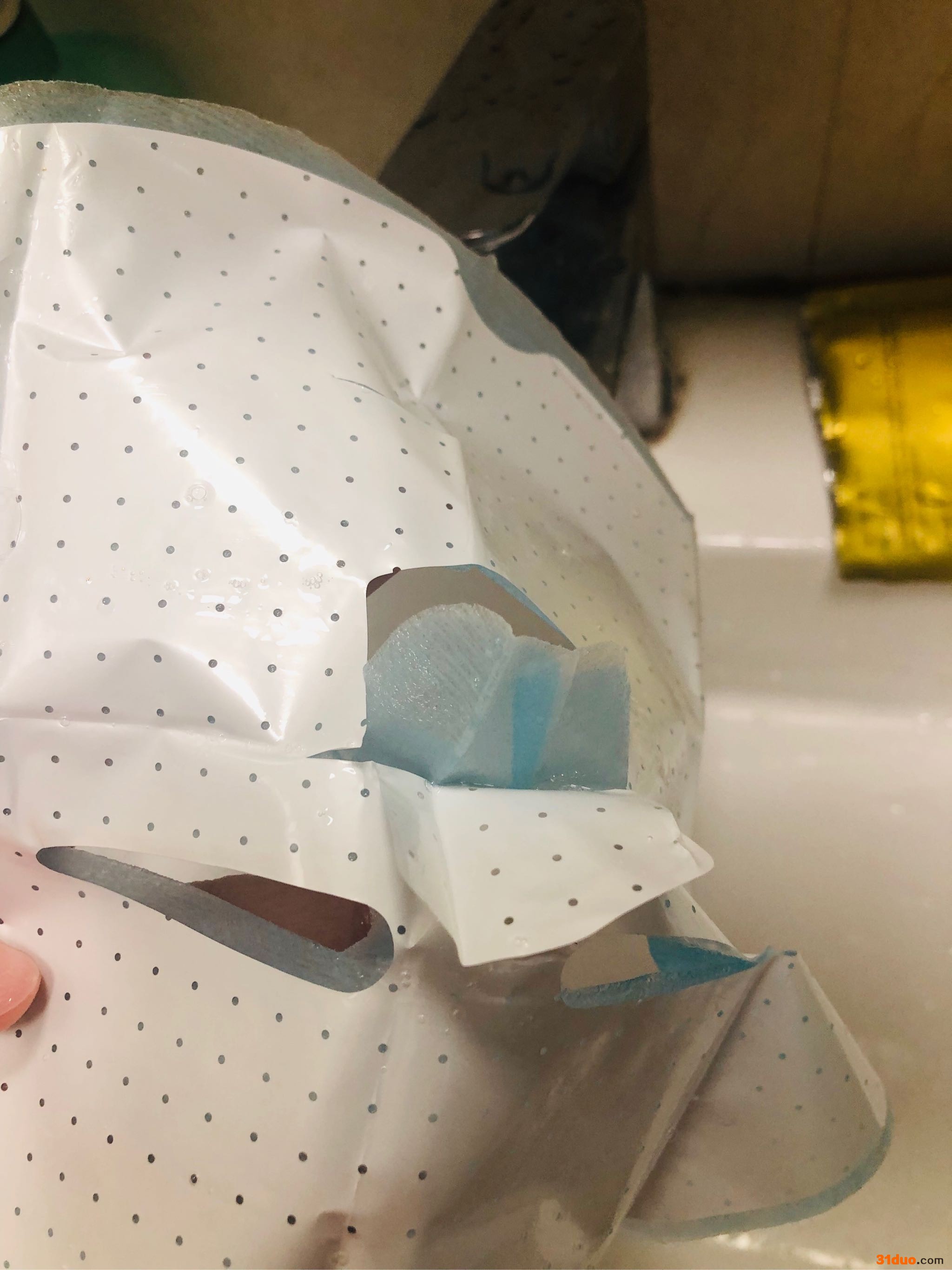 芮一面膜有三层,中间那层是敷脸上的,敷面膜的时候先撕开最上面白色一层膜,另外两层再敷到脸上,等敷好后再撕掉外面一层,好处应该是锁住面膜水分又能轻松的把面膜敷到脸上。