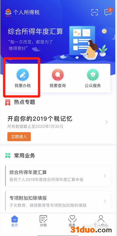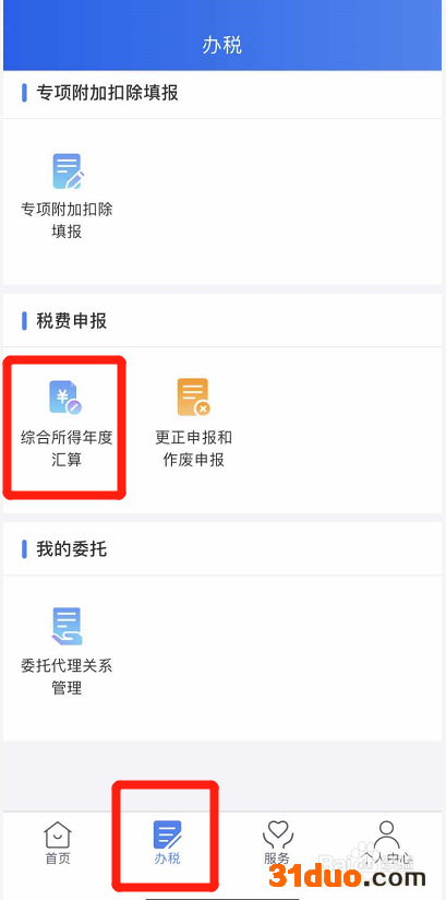 3、在税费申报板块里,进入“综合所得年度汇算”。